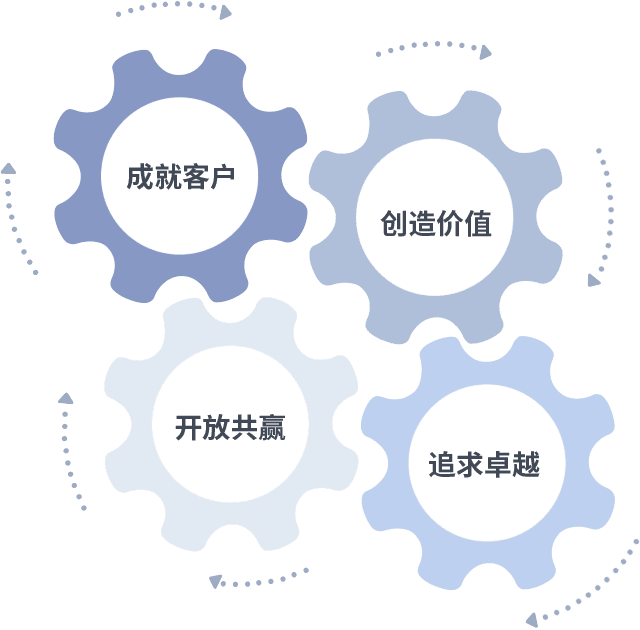 成就客户是一切决策的出发点,,创造价值是衡量所有工作的标准,,,追求卓越是我们做事做人的态度,,,开放共赢是我们的格局也是最终的结果。。。价值观的齿轮环环相扣,,,推动着组织里的每个人不断向前。。。